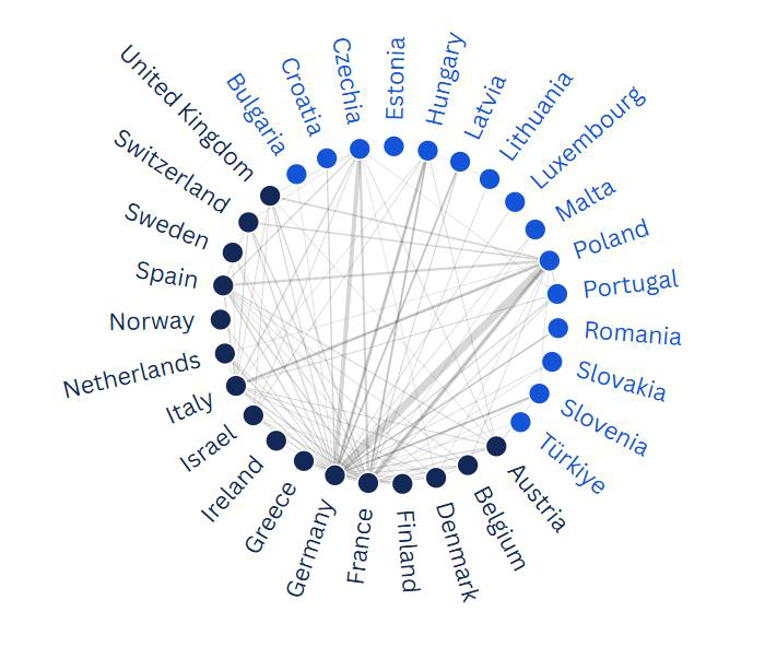 Research consortia within QuantERA are embedded in an increasingly dense network of collaborations, in which Widening Countries play a growing and more visible role. While many of the strongest connections continue to link Widening and non-Widening research systems, new patterns of cooperation are also emerging between Widening Countries themselves. These widening–widening links, though still less frequent, signal the gradual development of regional cohesion.